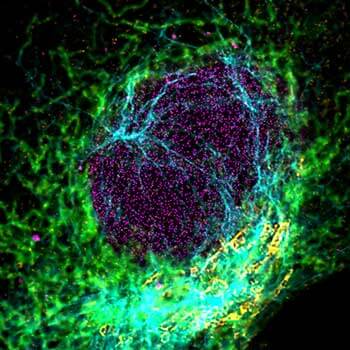 It’s virtually impossible to overestimate the complexity of what’s going on inside a cell. Multicolor staining is a way to visualize at least some of the countless subcellular structures. This four-color STED image shows Vero cells stained for F-actin (red, abberior STAR RED phalloidin), vimentin (cyan, STAR 460L), nuclear pore complexes (green, STAR ORANGE), and golgi (yellow, CF594). STAR ORANGE and CF594 were separated by their fluorescence lifetime with TIMEBOW imaging.