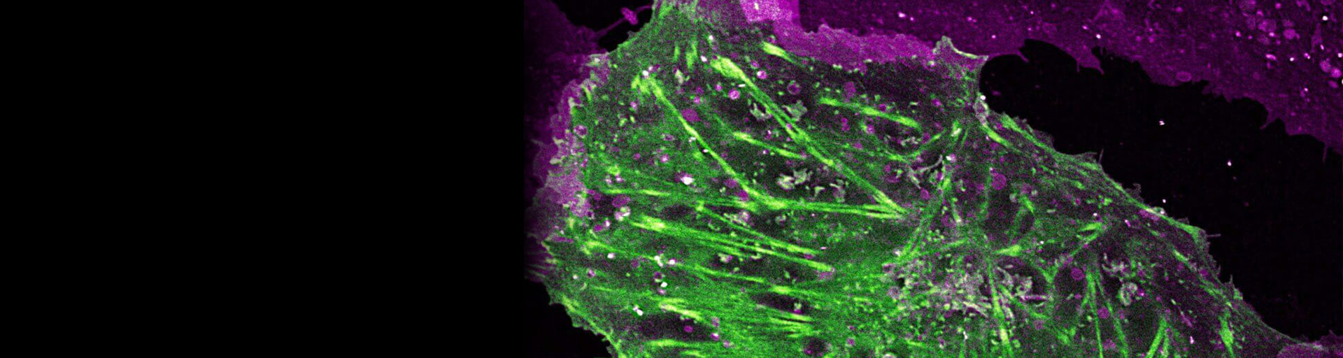 Two-color STED image of a living cell expressing actin K118TAG incorporating TCO*A labeled with abberior LIVE 590 click (green). The plasma membrane is highlighted with STAR RED membrane (magenta).